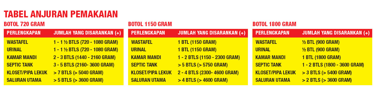 • Aman untuk semua sistem plastik perpipaan standar dan septic tank setelah di flushing.