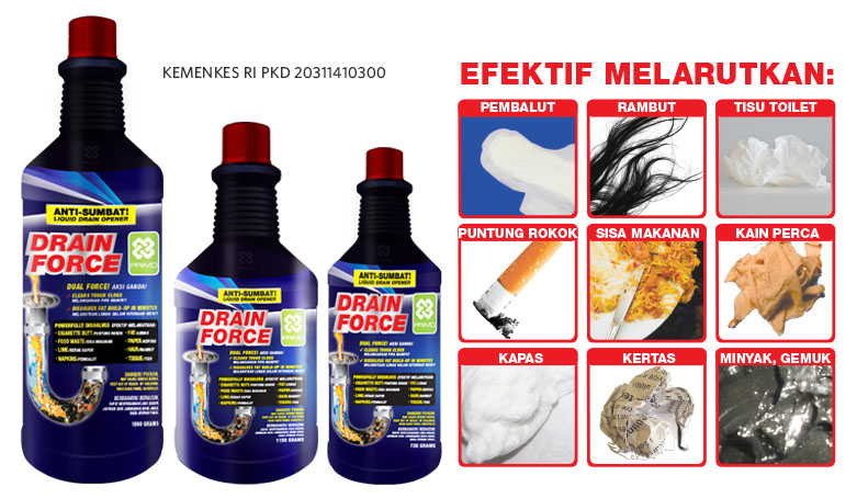 • DRAIN FORCE jauh lebih berat daripada air, formula ini akan langsung mengalir ke sumbatan dan segera bekerja.